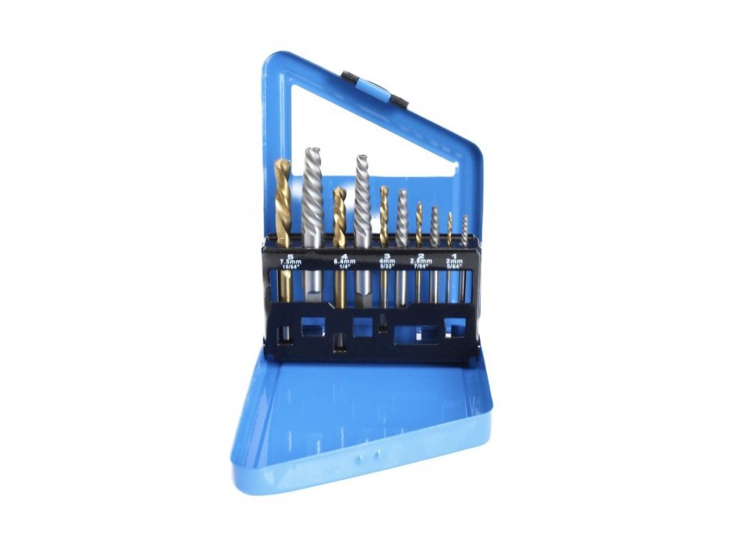Sada vytahovačů zalomených šroubů, s vrtáky SATRASada levostranných vrtáků a vytahováků pro odstraňování zlomených šroubů, svorníků, opracovaných šroubů nebo pravostranných potrubních tvarovek. Vytahováky mají spirálovou drážku, která se automaticky zakousne hlouběji do vytahovaného šroubu....