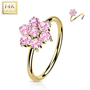 Zlatý piercing kruh s ozdobnou kytičkouZlatý piercing - kruh je vyroben ze 14ti karátového žlutého zlata jakostního označení 585/1000rozměr0,8 x 8 mmmateriálzlato žluté (Au 585/1000)barva kamenerůžovádruh kamenezirkonhmotnost0,29 gumístěnído ucharozměr kytičky5 mmVýrobceSperky4U weiter lesen