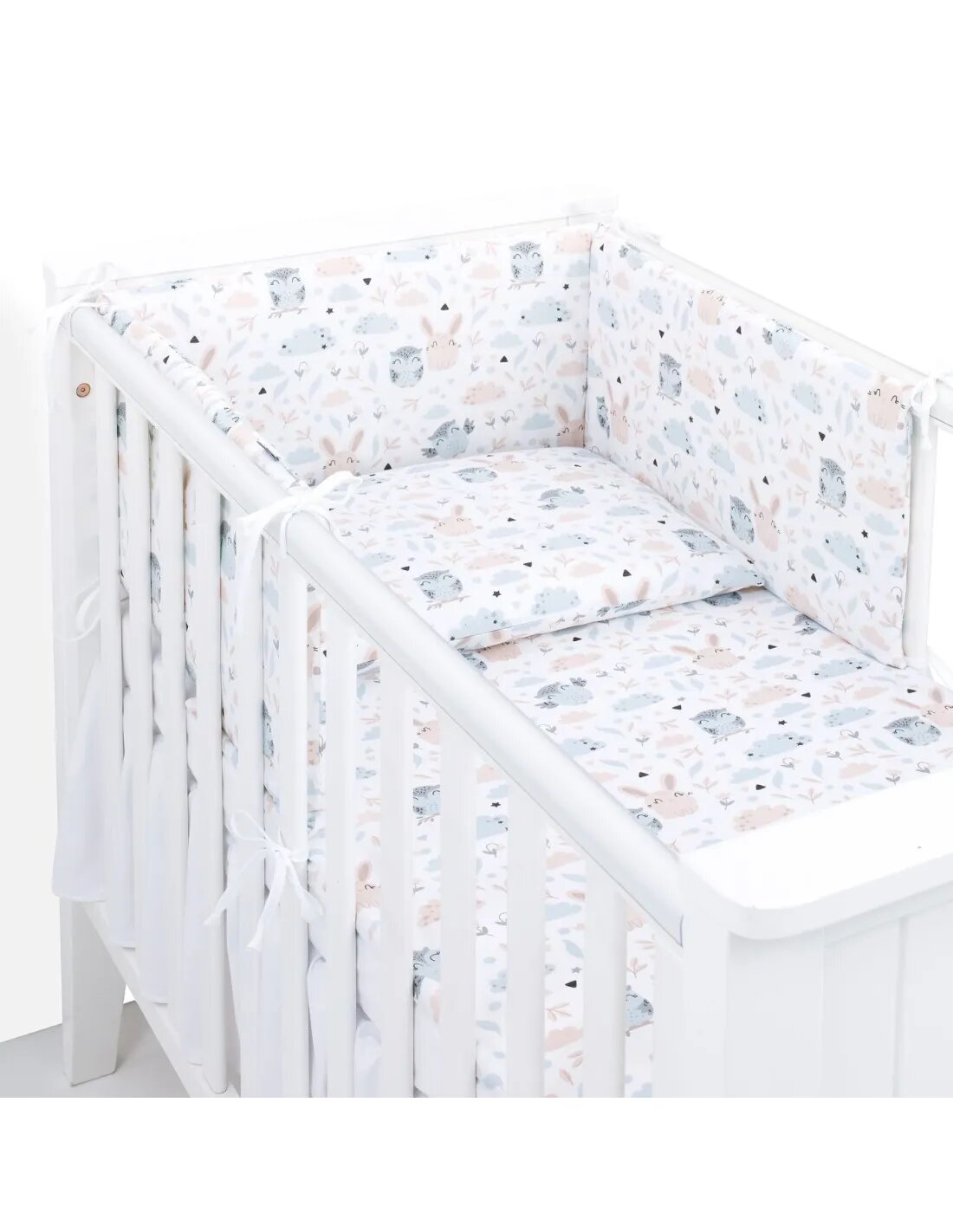 3-dílný set do postýlky Sada obsahuje: Mantinel – dvoubarevný – 30 × 180 cm, upevňuje se pomocí 8 stuh. Povlečení na polštářek – dvoubarevné – 40 × 60 cm. Povlečení na peřinku – dvoubarevné – 135 × 100 cm. Mantinel je vyroben ze 100 % bavlny, která je příjemná a hebká na dotek. Ideální pro...