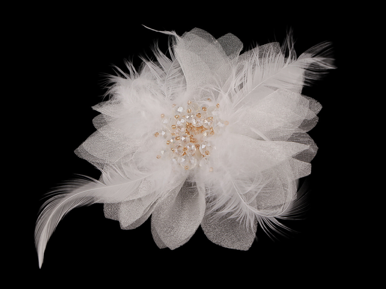 Brož se skleněnými broušenými korálky a peřím - 1 ks - 1 bílá