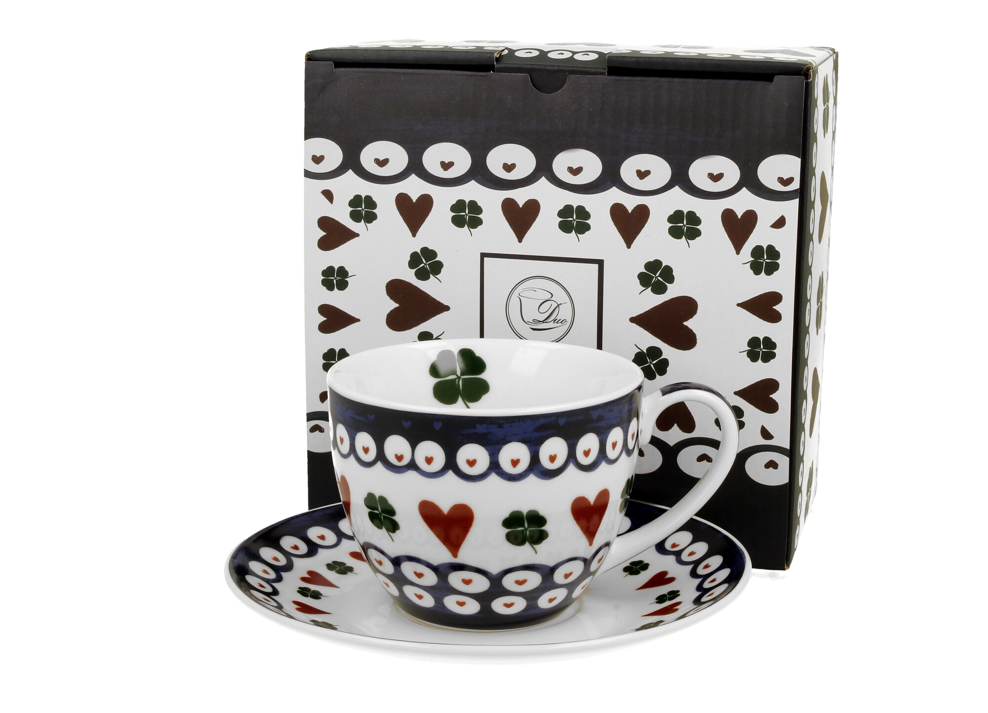 Filiżanka ze spodkiem INDIGO 3 wchodząca w skład serii ETNO, wykonana z porcelany New Bone China, charakteryzującej się elegancką i naturalną kremowo - białą barwą z delikatnym połyskiem, a także wyjątkową wytrzymałością.Linia zdobiona motywem malowanych serduszek i koniczynek. Intensywne i...