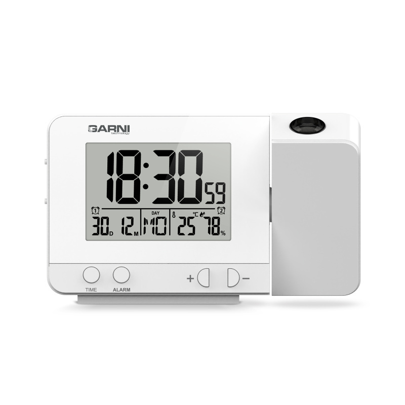 Digitální budík s projekcí času a vnitřní teploty s LCD displejem, časem řízeným rádiovým signálem DCF-77 a měřením vnitřní teploty a relativní vlhkosti