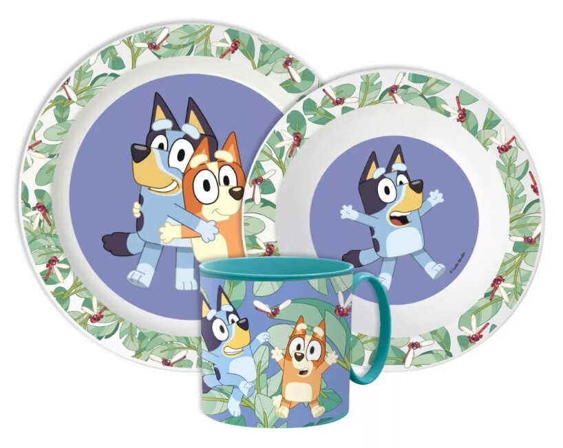 Plastový jídelní set BLUEY tropical s hrnkem modrý