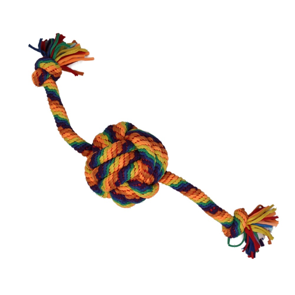 Duhová lanová hračka s 2 uzly a velkým spleteným míčem uprostřed.Ideální pro podporu dentální hygieny. Hravým způsobem čistí zuby a mezizubní prostory bavlněnými vlákny.Hračka je vhodná pro společnou hru s vaším mazlíčkem a k přetahování. Lano je velice pevné a odolné. ​Vhodné pro velká a obří... weiter lesen