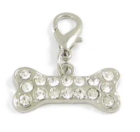 Přívěšek na obojek ve tvaru kosti vykládaný kamínky.Pomocí karabinky můžete připnout kdekoliv.Materiál: zinkoslitina, povrchová úprava chrom weiter lesen