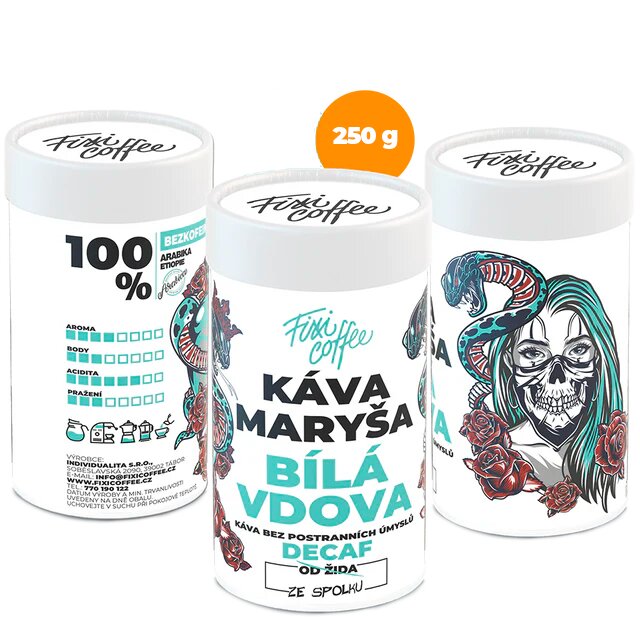 Káva Maryša – Bílá vdova, bezkofeinová káva – dárková káva jemně mletá / papírová tuba / 250 g