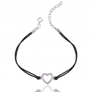 Textilní náramek dekorovaný přívěškem ve tvaru srdíčka, které je vyrobeno z rhodiovaného stříbra 925/1000 a je zdobeno kubickými zirkony čiré barvy.