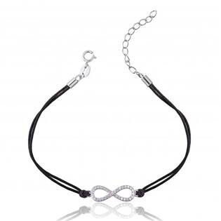 Textilní náramek dekorovaný přívěškem ve tvaru symbolu nekonečno, který je vyroben z rhodiovaného stříbra 925/1000 a je zdoben kubickými zirkony čiré barvy.Délka náramku je 16 cm + 3 cm prodloužení. Náramek ani komponenty komponenty neobsahují nikl, náramek je tedy vhodný i pro alergiky.Šperk...