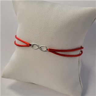 Červený textilní náramek dekorovaný stříbrným přívěskem s motivem nekonečno - infinity. Ozdobný prvek je pokoven vrstvou rhodia, která chrání stříbro před nežádoucím černáním.