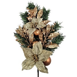 Gałązka świerkowa ze złotymi poisencjami i złotymi kulkami zdobiona brokatem, Ziemia Obiecana