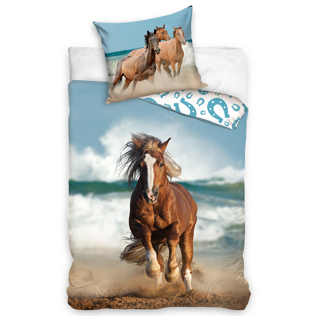 Bavlněné povlečení Kůň na PobřežíSíla a elegance v každém detailuBavlněné povlečení Kůň na Pobřeží potěší všechny milovníky koní a přírodyRealistický motiv hnědého koně cválajícího po pláži s vlnami v pozadí působí živě a promění každé usínání v pocit svobody a dobrodružstvíBavlněné povlečení Kůň...
