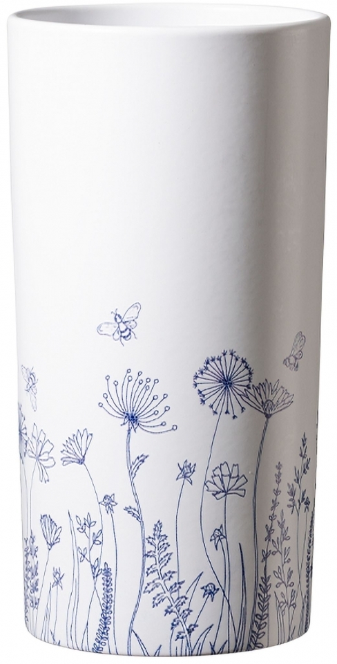Bílá keramická váza s modrými květinami 11 x 21 cm