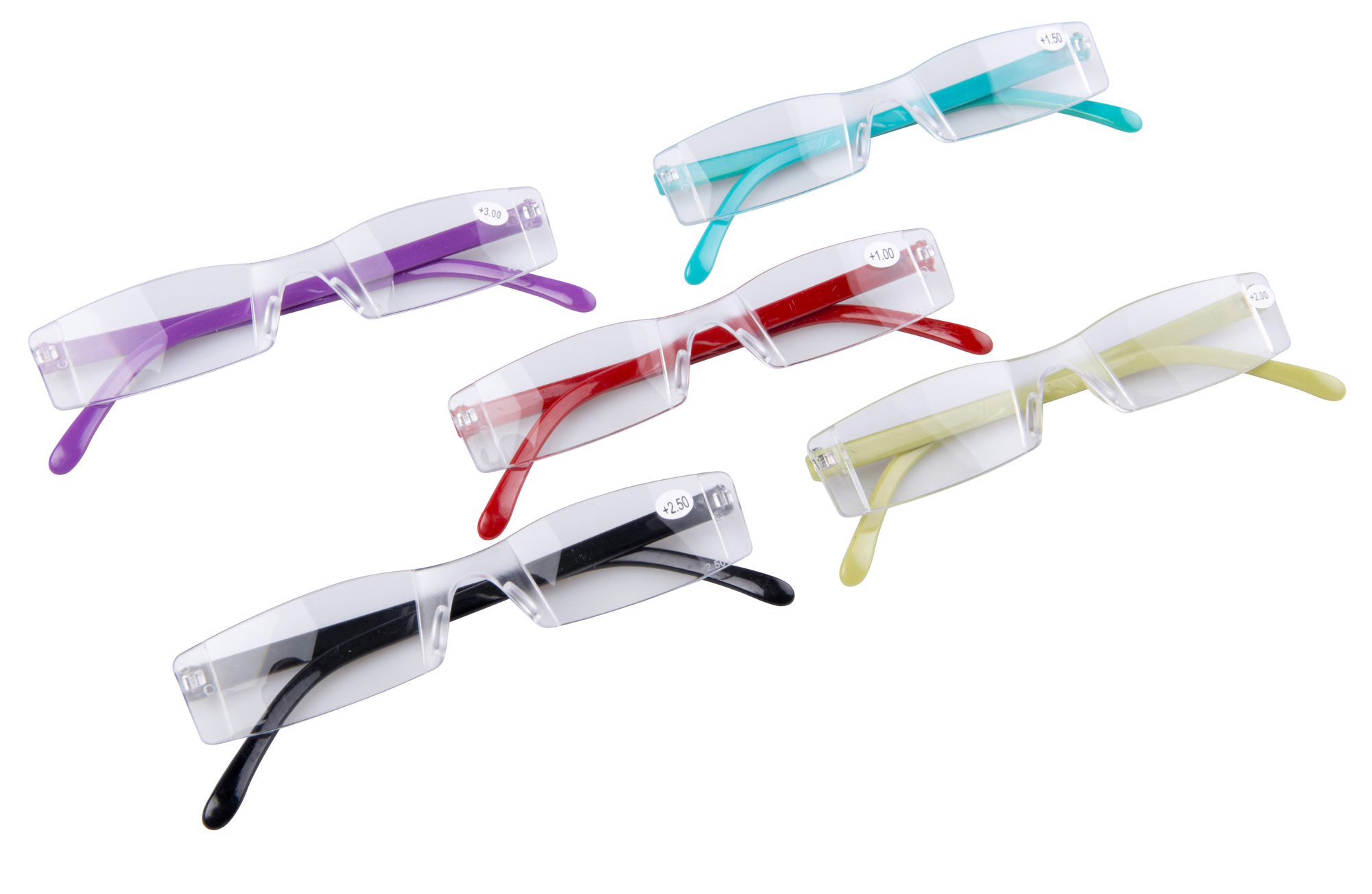 Bezrámečkové moderní brýle na čtení v 5 různých barvách a 6 sílách dioptrií.Barva: černá, zelená, fialová, červená a smaragdováDioptrie: 1.00, 1.50, 2.00, 2.50, 3.00, 3.50Možnost výběru barvy a dioptrií - prosím specifikujte poznámkou v objednávceMateriál: PolykarbonátSklo výška: cca 26 mmSklo... weiter lesen