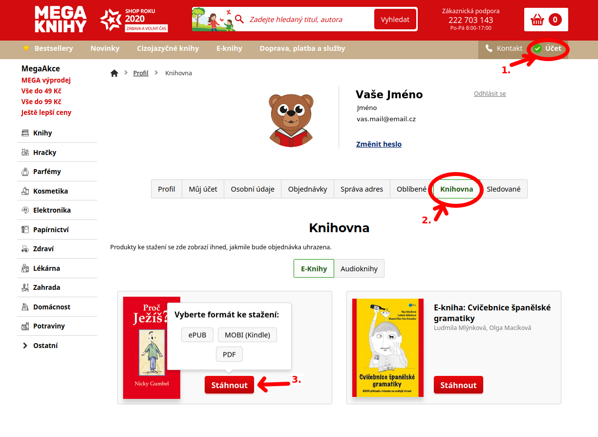 Po přihlášení ve vašem účtu najdete svojí knihovnu, ve které se nachází všechny zakoupené e-knihy. Najděte e-knihu, kterou si chcete stáhnout. Pokud je knížka ve více formátech, můžete si zde vybrat v jakém formátu si chcete knížku stáhnout.