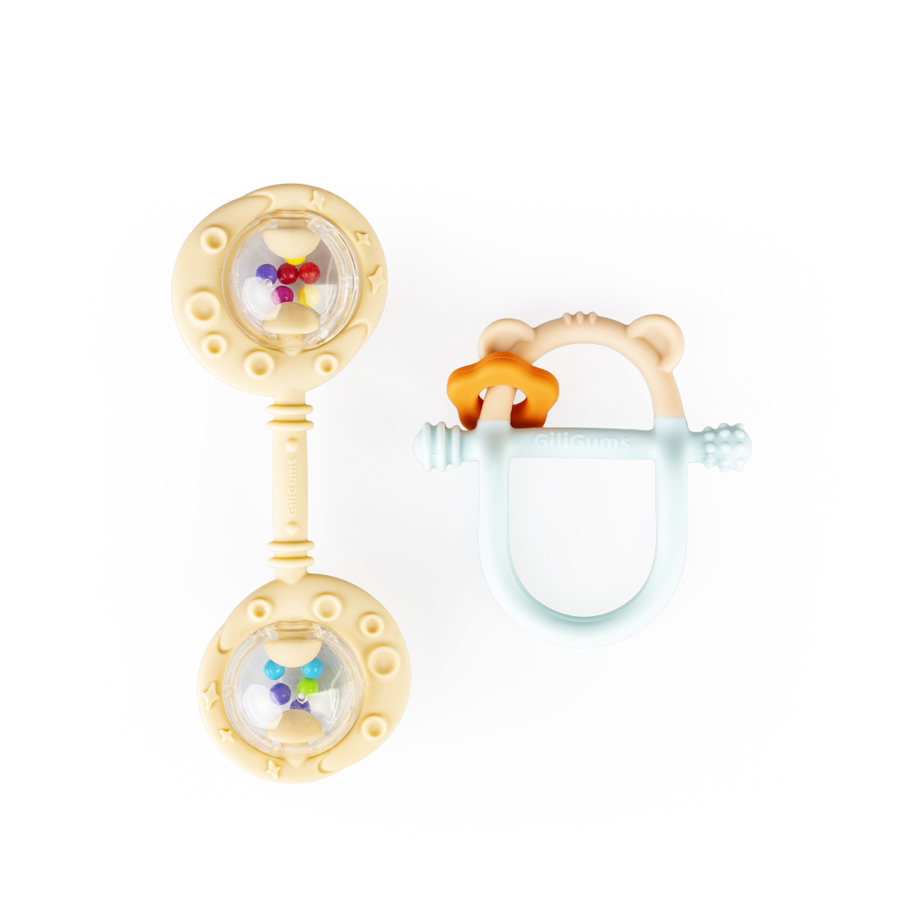 Dwupak łączy w sobie walory praktyczne i estetyczne, bawiąc oraz przynosząc ulgę w ząbkowaniu! W zestawie znajdziemy gryzak Miś oraz Podwójną Grzechotkę w kolorze beżowym. Obie zabawki posiadają wypustki, które podczas gryzienia będą delikatnie masować dziąsła ząbkującego bobasa. Kształt...