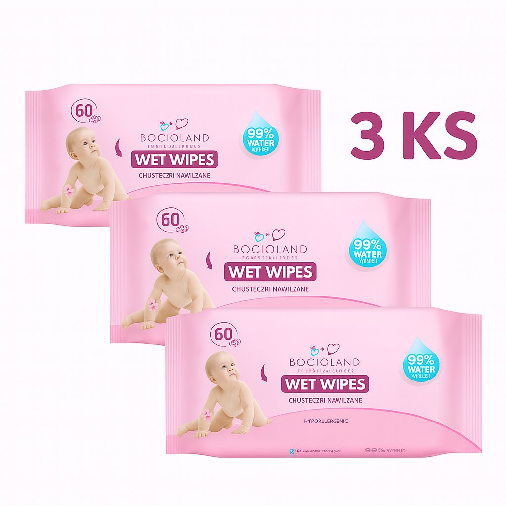 Výhodné balení – 3x Vlhčené čistící ubrousky 99 % voda 60 ks ubrousků Nežná péče a maximální bezpečnost pro citlivou pokožku novorozenců. Ubrousky Bocioland jsou vyvinuty pro rodiče, kteří hledají čistotu, jemnost a transparentní složení. Jemné jako voda, přesto účinné díky šetrnému dotyku aloe...