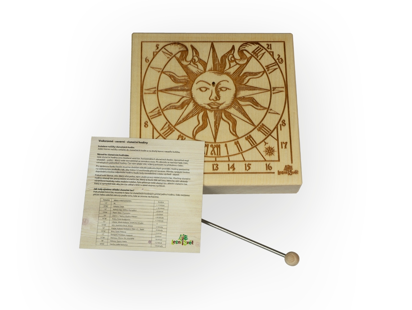 Sluneční hodiny vyrábí u nás v dílně české ruce z kvalitního certifikovaného dřeva Balení obsahuje 1x sluneční hodiny z bukového masivu, 1x tyčku a dřevěný korálek k hodinám, 1x návod na používání hodin. Hodiny ukazují orientační čas. Hodiny jsou natištěné. Baleno v sáčku. Autorem kreseb...
