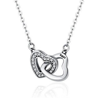 Stříbrný náhrdelník s přívěškem ve tvaru dvou propletených srdíček dekorovaných zirkony čiré barvyNáhrdelník je vyroben ze stříbra jakosti 925/1000 a je povrchově rhodiovánRhodium patří mezi drahé kovy, patřící do skupiny platinových a chrání stříbro před černáním, zvyšuje lesk šperkůpovrchová...