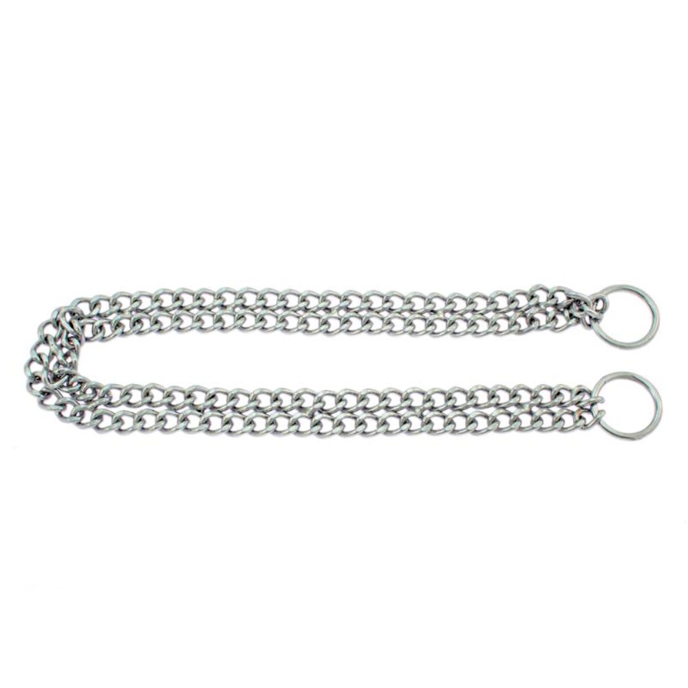Dvouřadý řetízkový stahovací obojek, šlifované články.Vodítko se přichycuje za kovové očko a provléká se.Svařováno, ukončen kroužky.Materiál: OcelPovrchová úprava: PochromovánoVelikost: 55 cm, ø 0,25 cm weiter lesen