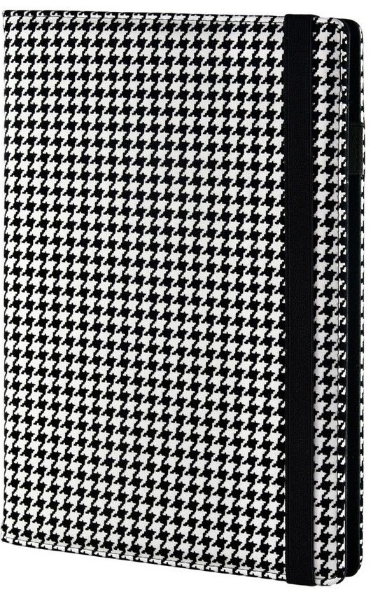 Okładka ręcznie wykonana z dwuwarstwowego poliuretanu.Zewnętrzna warstwa jest z zamszowego wypukłego zamszu przyjemnego w dotyku.Okładka jest w wersji kolorystycznej czarno-białej we wzór pepitka.Wnętrze wykończone czarnym zamszem. Seria Modena posiada zapięcie na gumkę.Okładka trudna do...