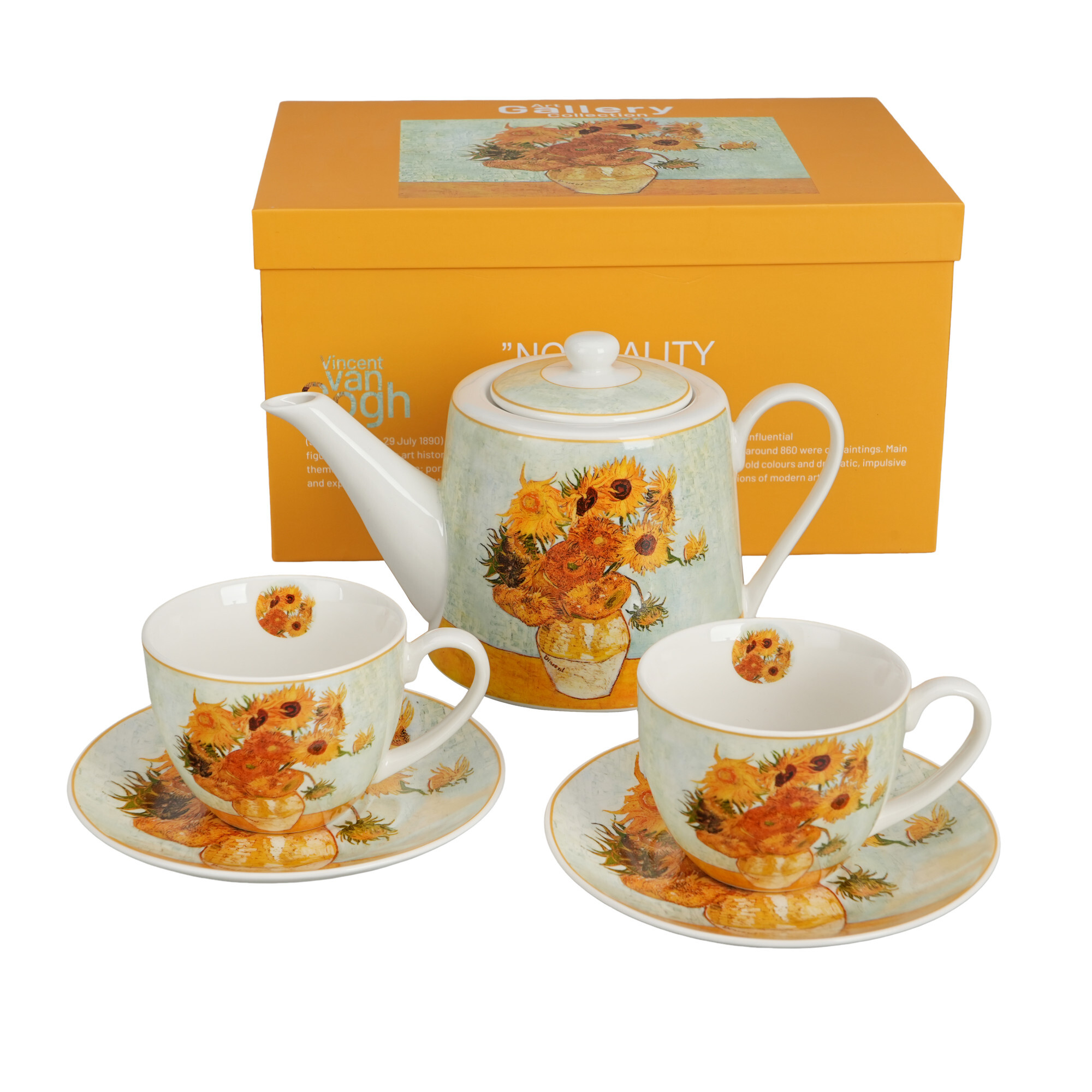 Zestaw dzbanek z zaparzaczem ze stali nierdzewnej i 2 filiżanki ze spodkami SUNFLOWERS inspired by Van Gogh