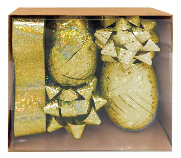 Sada na balení dárků zlatá, rozeta 5 x 2 x 5 cm 4 ks, stuha 0,5 cm x 10 m 2 ks, stuha 2 cm x 2 m