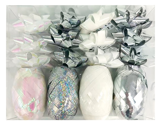 Sada na balení dárků stříbrná, rozeta 5 x 2 x 5 cm 12 ks, stuha 0,5 cm x 10 m 4 ks