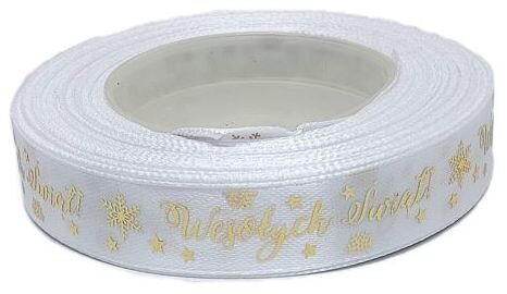 Wstążka metal Wesołych Świąt, 15mm/18mb biała/złoto, Florystyka