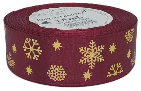 Wstążka metal Śnieżynki, 25mm/18mb, bordo/złoto, Florystyka