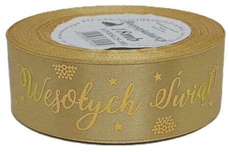 Wstążka metal Wesołych Świąt, 25mm/18mb, złoto/złoto, Florystyka