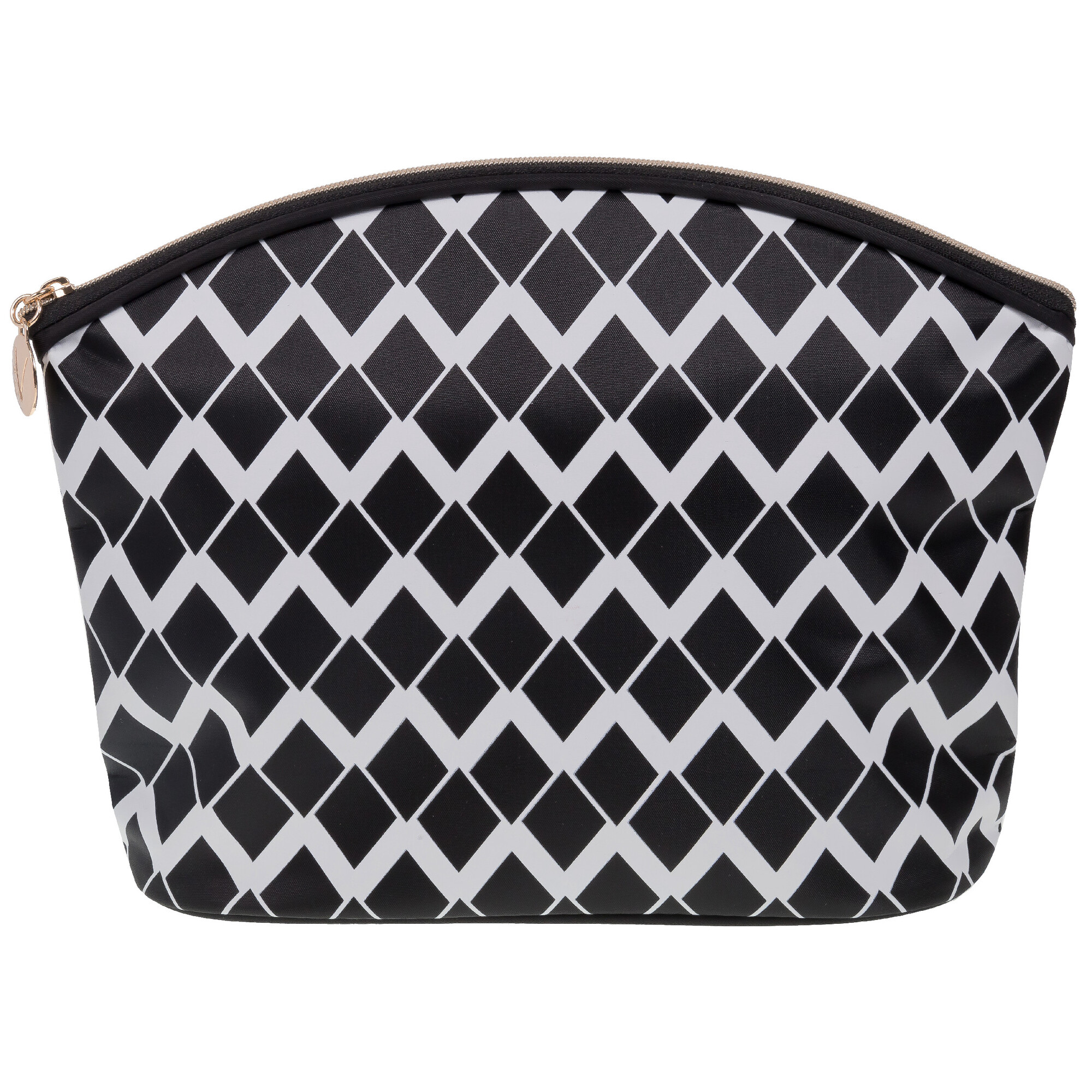 Kosmetická taška se vzorem kosočtverců v černobílém provedení se zlatým zipem. Materiál: nylon, polyester, kov. Velikost: 26,5x8x19 cm. Díky své velikosti i materiálu je taška vhodná pro různé druhy kosmetických doplňků a pomůcek.Černobílá barva se navíc nikdy neomrzí, je univerzální, a tak může...