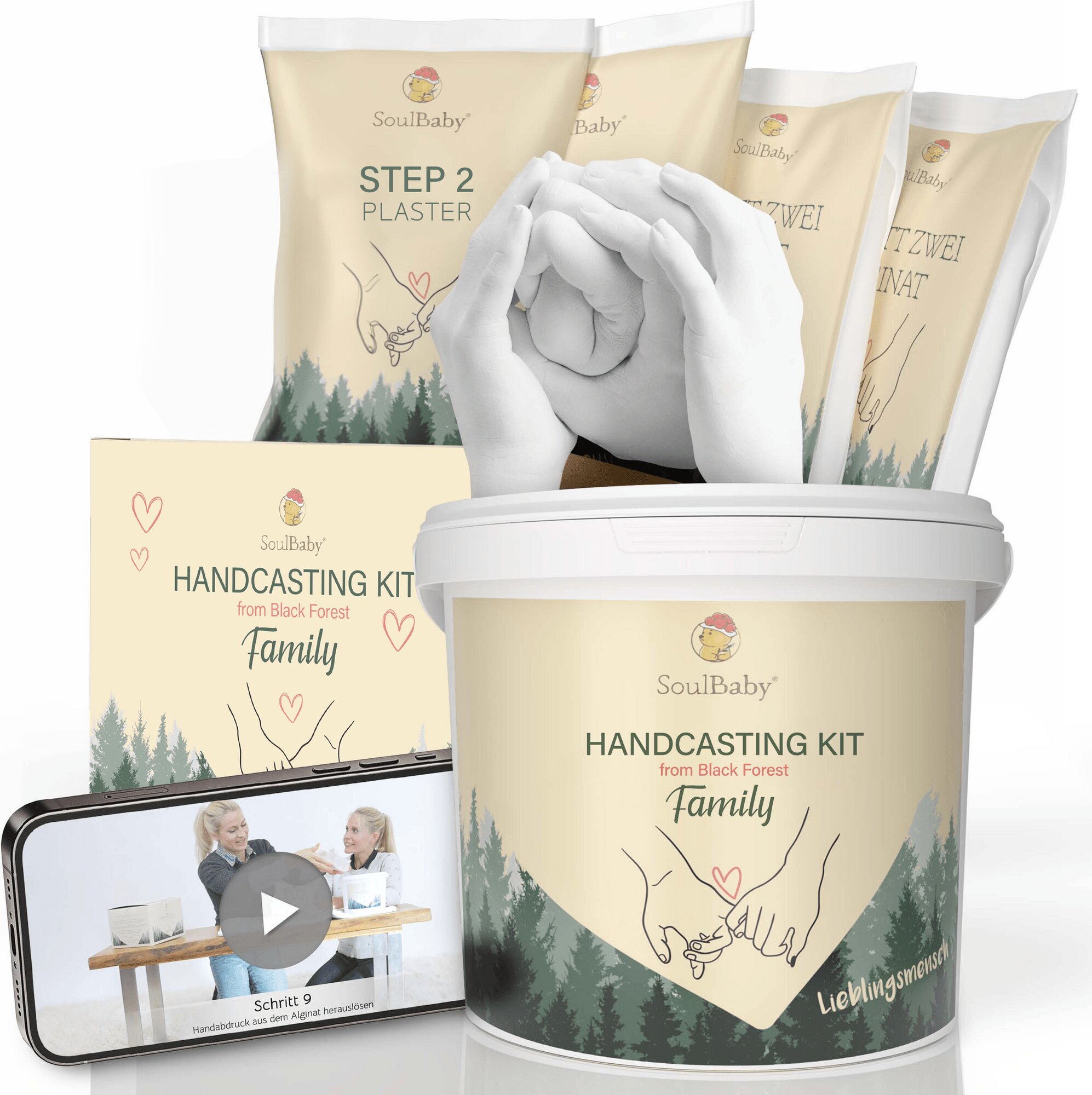 Kompletní sada Premium - máte vše, co potřebujete pro detailní odlitek ruky a společné šťastné chvíle Extra velké pro 4 - 5 rukou - díky extra velkému kbelíku, je 3D sada odlitků ideální pro 4 velké ruce a nabízí dostatek prostoru pro prvotřídní sádrový odlitek v libovolné individuální póze...