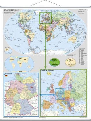 Stiefel Wandkarte Großformat Deutschland und Europa in der Welt (politisch), mit Metallstäben