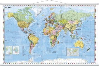 Stiefel Wandkarte Kleinformat Weltkarte politisch mit Flaggenrand, deutschsprachig, mit Metallstäben