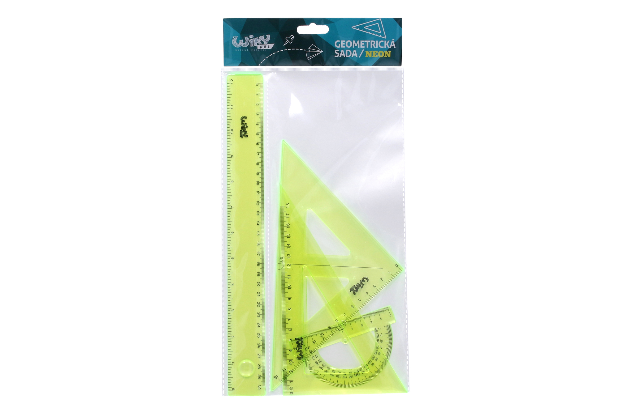 Pravítka nesmí chybět v žádné školní výbavě! Sada v neonových barvách bude skvělým pomocníkem při hodinách geometrie! Vše vyrobeno z průhledného plastu s jasně viditelnými ryskami