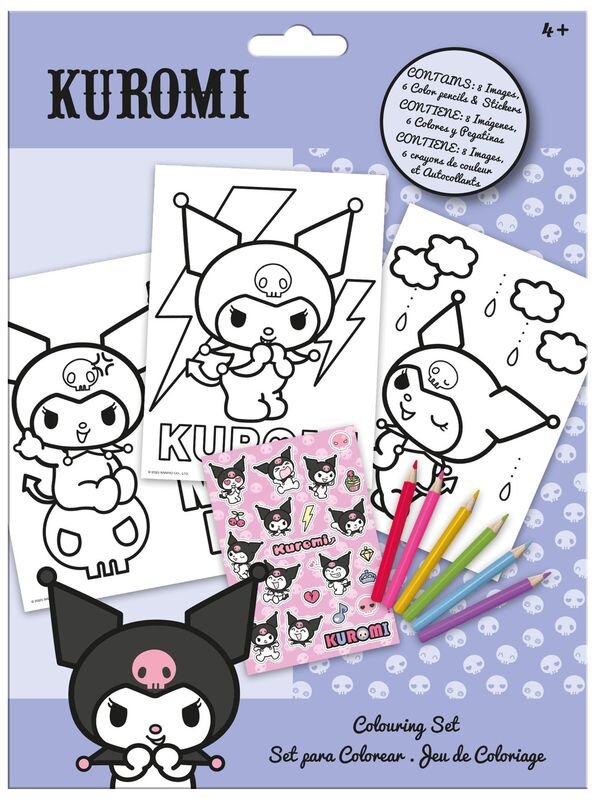 Zestaw do kolorowania z ulubionymi postaciami ze świata Kuromi. • Zestaw do kolorowania• Materiał: papier, drewno, PVC• Wymiary: 28,5x21x1 cm• Zawartość: 8 kart do kolorowania, naklejki, 6 kredek, weiter lesen