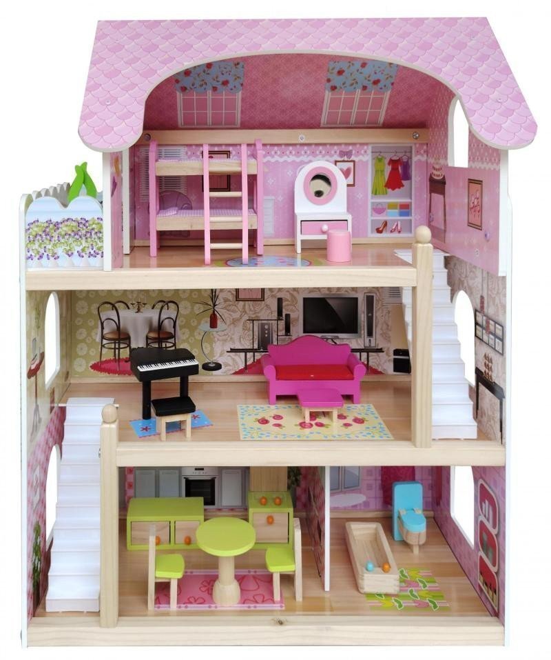 Krásná dřevěná vila po panenky v moderním stylu bude splněným snem každého dítěte. Domeček pro panenky má 3 patra, která jsou propojena schodištěm. V domečku jsou celkem 4 pokoje a balkon – vše imituje dokonale skutečný bytový dům. Vhodné pro panenky o max. velikosti 18 cm. 4 panenky jsou...