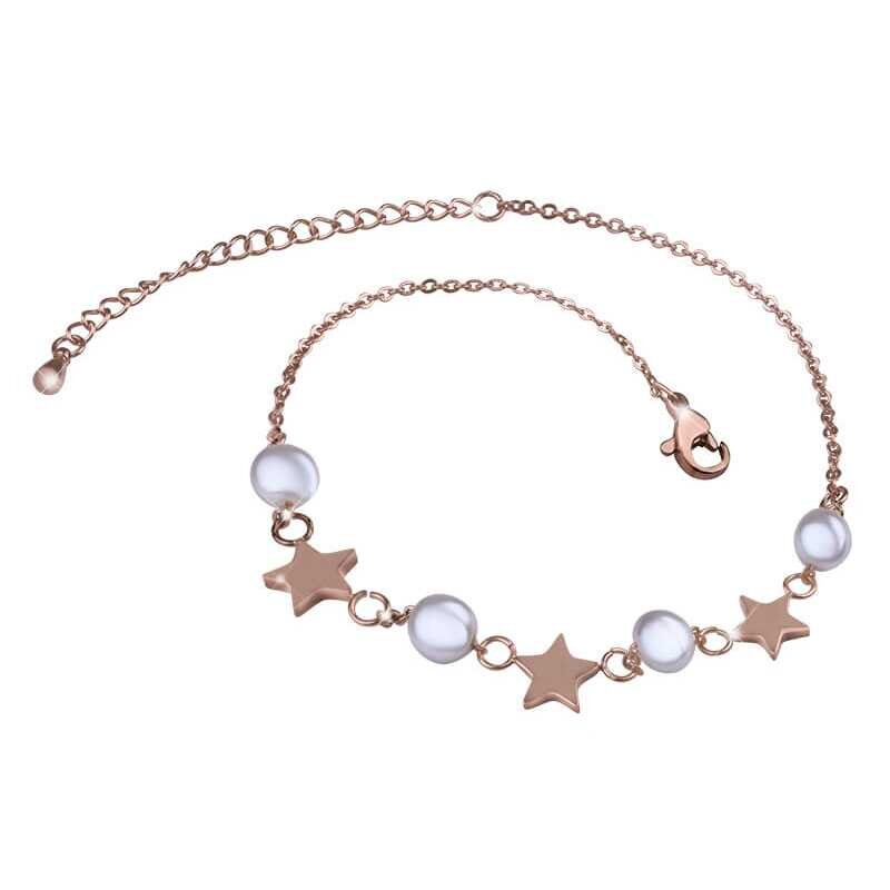 Elegantní náramek na nohu od značky Troli dodá vašemu outfitu jedinečný šarm. Vyrobený z kvalitní oceli a pozlacený růžovým zlatem, náramek zdobí nádherné syntetické perly a jemné hvězdičky. S nastavitelnou délkou 21 + 5 cm se perfektně přizpůsobí vašemu kotníku. Tento nadčasový šperk podtrhne vaši ženskost a stane se skvělým doplňkem pro každou příležitost.