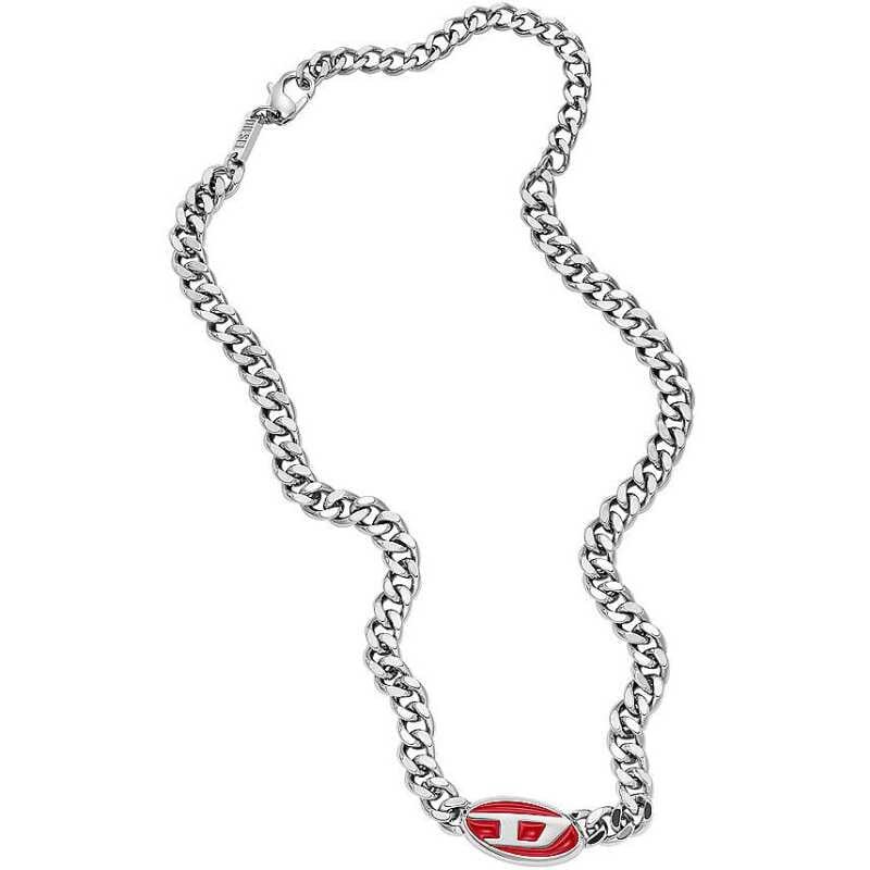 Stylový pánský náhrdelník značky Diesel přináší kombinaci elegance a moderního designu. Je vyroben z kvalitní oceli a dominuje mu výrazná ozdoba ve tvaru loga, která je doplněna červeným smaltem. Délka 40 cm s možností prodloužení o 10 cm umožňuje snadné přizpůsobení. Tento šperk nejenže podtrhne váš osobitý styl, ale také dodá vašemu outfitu jedinečný nádech.