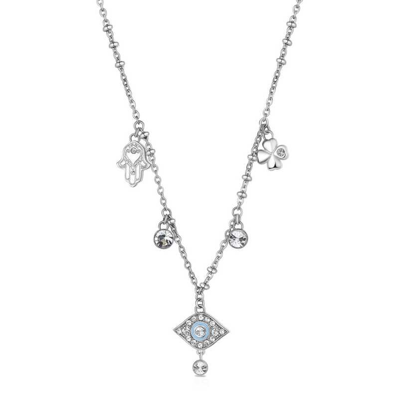 Tento elegantní náhrdelník značky Brosway přináší do vašeho šperkovníku šarm a symboliku. Vyroben z kvalitní oceli, zdobí ho přívěsky s motivy Fátimina ruky, čtyřlístku a vševidoucího oka, které vás ochrání a přinesou štěstí. Čiré krystaly dodávají šperku oslnivý třpyt, díky čemuž se stane...