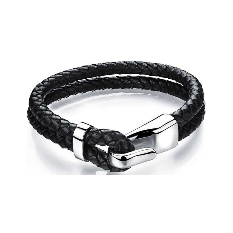 Černý kožený náramek s ocelovým hákem Leather Troli