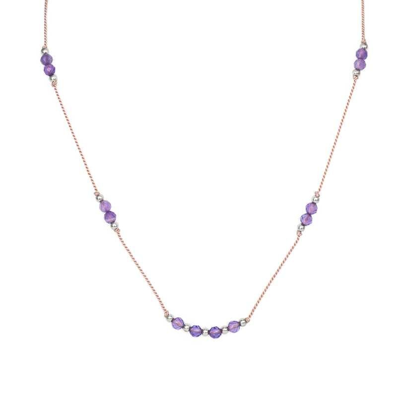 Elegantní dámský náhrdelník značky Agato kombinuje jemnost růžové hedvábné šňůrky s krásou vybroušeného ametystu a ocelových korálků. Délku náhrdelníku lze jednoduše upravit od 32 cm do 60 cm díky posuvné sponě. Ametyst, známý svou schopností přinášet klid a harmonii, vás podpoří v těžkých chvílích. Tento šperk je ideální pro zvýraznění dekoltu a dodání šarmu každému outfitu.