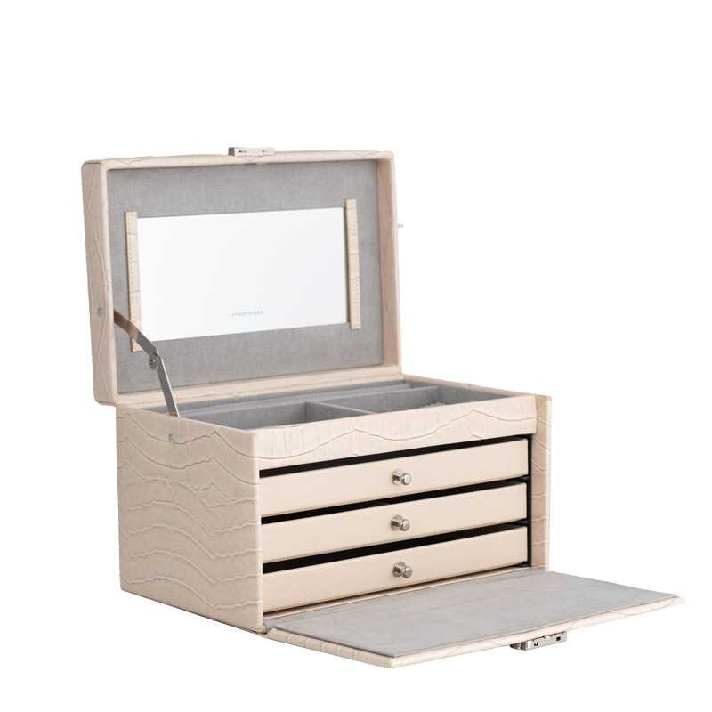 Šperkovnice od značky Friedrich Lederwaren spojuje eleganci s praktičností. Její exteriér z růžovo béžové kůže s krokodýlím vzorem dodává sofistikovaný vzhled, zatímco pastelově šedý interiér nabízí ideální prostor pro uspořádání šperků. V horním plate si můžete přehledně uschovat oblíbené...