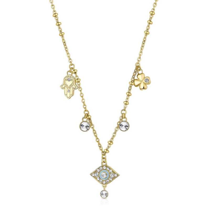 Stylový náhrdelník značky Brosway je ideální volbou pro každou ženu, která touží po elegantním a moderním doplňku. Vyrobený z kvalitní oceli a pokovený zlatým PVD povlakem, přináší nejen trvanlivost, ale i luxusní vzhled. Přívěsky s motivem Fátimina ruky, čtyřlístku a vševidoucího oka, doplněné...