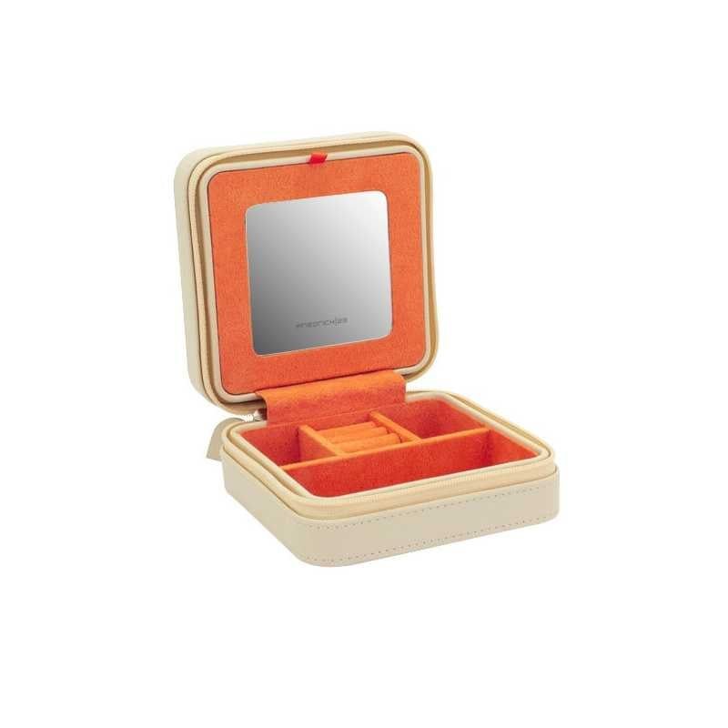 Béžová cestovní šperkovnice značky Friedrich Lederwaren je ideálním společníkem pro každou ženu. Hladká syntetická kůže s jemným reliéfem pírka dodává eleganci, zatímco hravá oranžová barva interiéru potěší oko. S praktickým zrcátkem na vnitřní straně víka a kompaktními rozměry 11,5 x 11,5 x 5,5...