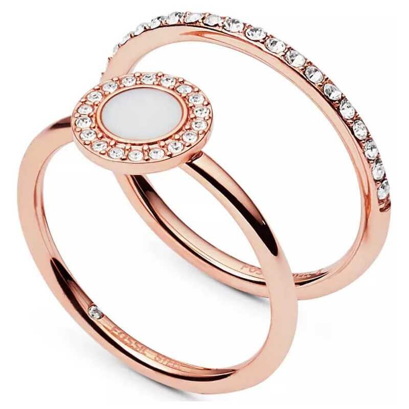 Elegantní prsten značky Fossil přináší spojení moderního designu a kvalitního zpracování. Vyrobený z odolné oceli s luxusním růžovým pozlacením, vyniká svým dvojitým provedením a nádhernými čirými krystaly, které dodávají šperku jedinečný lesk. Tento nadčasový kousek je ideálním doplňkem pro každou příležitost a zaručuje, že budete vypadat stylově a sofistikovaně.