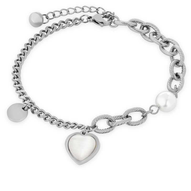 Elegantní náramek značky Troli je dokonalým doplňkem pro každou ženu, která si potrpí na jedinečné detaily. Vyrobený z kvalitní oceli, kombinuje jemný a masivní řetízek, který je zdoben perlou a přívěskem ve tvaru srdce a kruhu. S délkou 18 cm a možností prodloužení o 4 cm se snadno přizpůsobí...