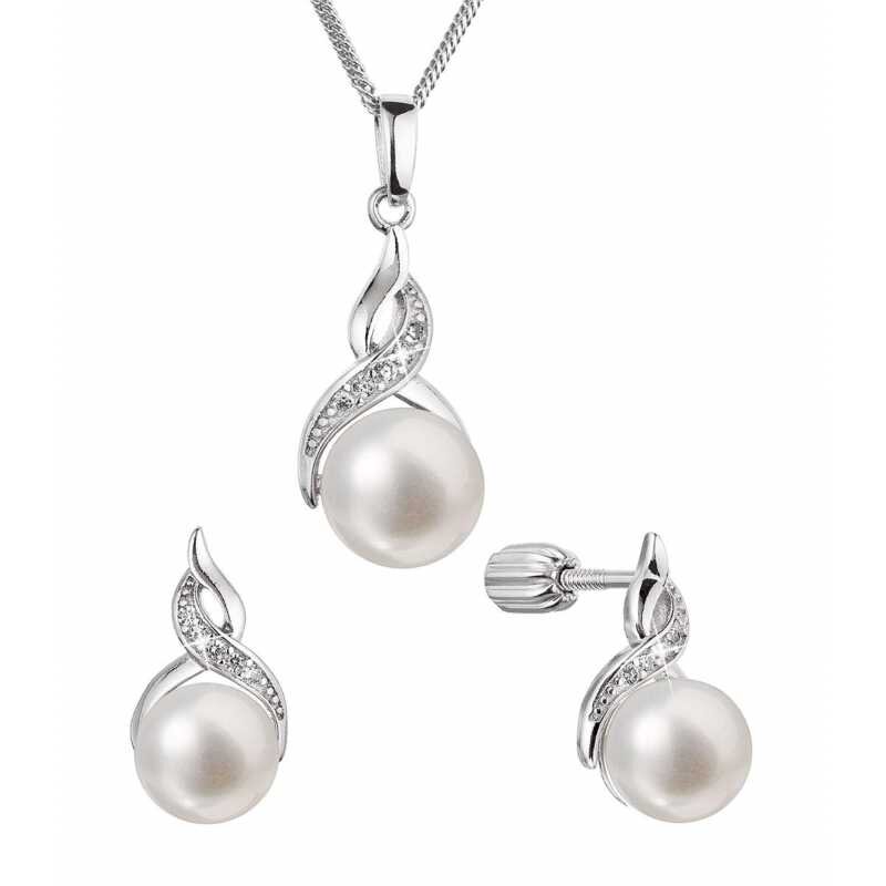 Luxusní stříbrná souprava s pravými perlami a zirkony 29054.1B (náušnice, řetízek, přívěsek) Evolution Group