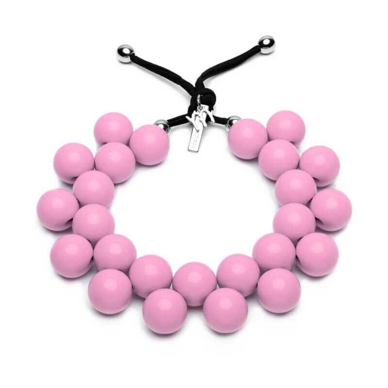 Tento ručně vyrobený náhrdelník od italské značky Ballsmania vyniká kombinací elegance a originality. Základ tvoří černá pružná šňůrka, na níž jsou pečlivě navlečeny pryskyřicové korálky v jemných odstínech růžové a fialové. S průměrem korálků cca 2,5 cm se náhrdelník přizpůsobí vašemu krku a dodá vašemu outfitu moderní nádech. Vytvořte si osobitý styl s tímto nadčasovým šperkem.