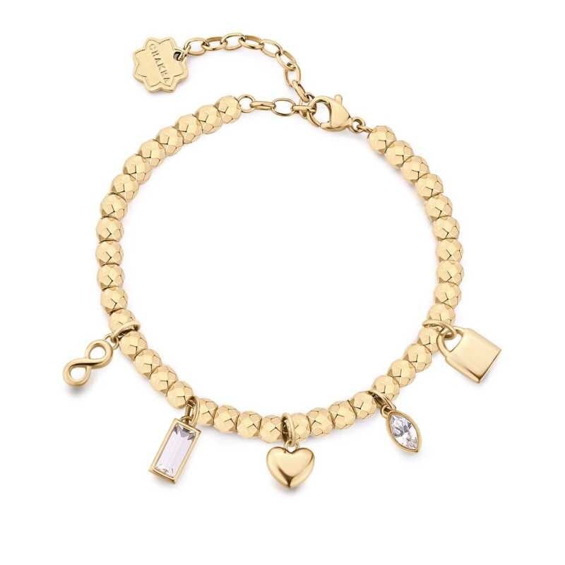 Elegantní korálkový náramek od značky Brosway je skvostným šperkem, který potěší každou ženu. Vyrobený z kvalitní oceli a pokovený zlatým PVD povlakem, vyniká svými přívěsky s motivem srdíčka, nekonečna a zámku. Dva vybroušené čiré krystaly dodávají náramku na výjimečnosti. Délka 18 cm a...
